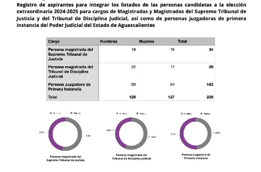 Una vez realizado el cierre de registros de la convocatoria a las 11:59 pm del día 19 de enero de 2025, el Comité de Evaluación del Poder Judicial del Estado de Aguascalientes concentró la información, con los resultados que arrojan una participación paritaria entre hombres y mujeres; lo anterior en el entendido que una persona puede estar registrada para más de un cargo.