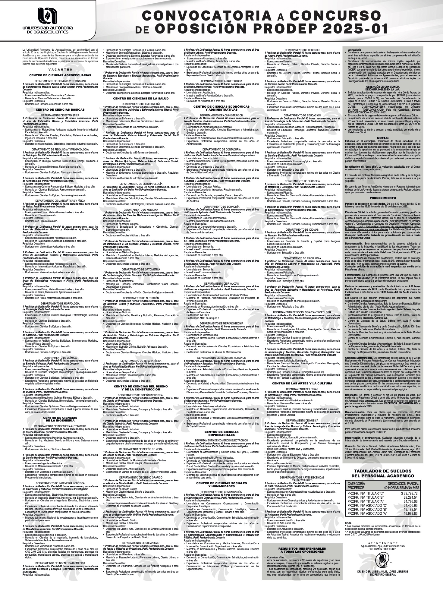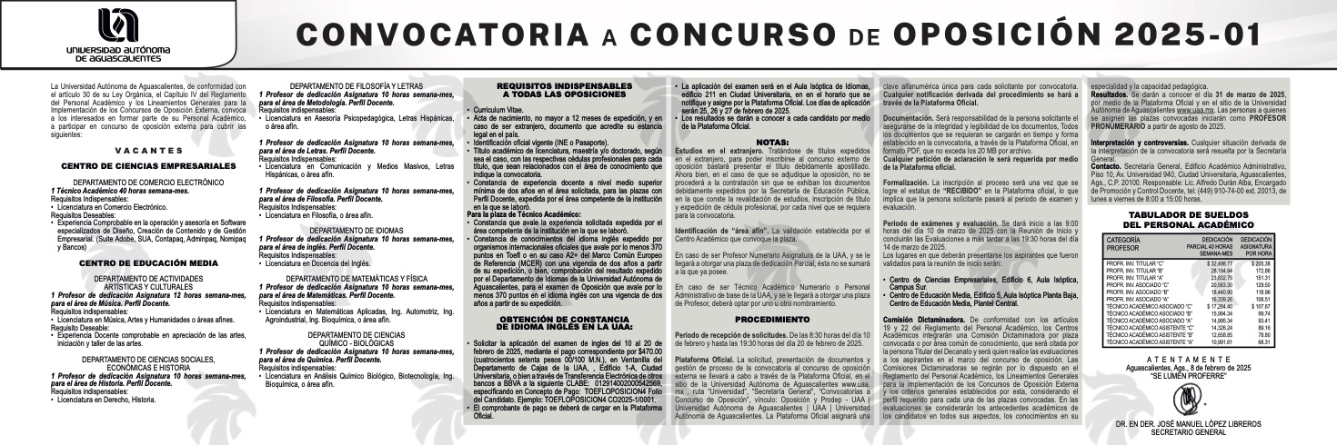 La Universidad Autónoma de Aguascalientes, de conformidad con el artículo 30 de su Ley Orgánica, el Capítulo IV del Reglamento del Personal Académico y los Lineamientos Generales para la Implementación de los Concursos de Oposición Externa, convoca a los interesados en formar parte de su Personal Académico, a participar en concurso de oposición externa para cubrir las siguientes vacantes: