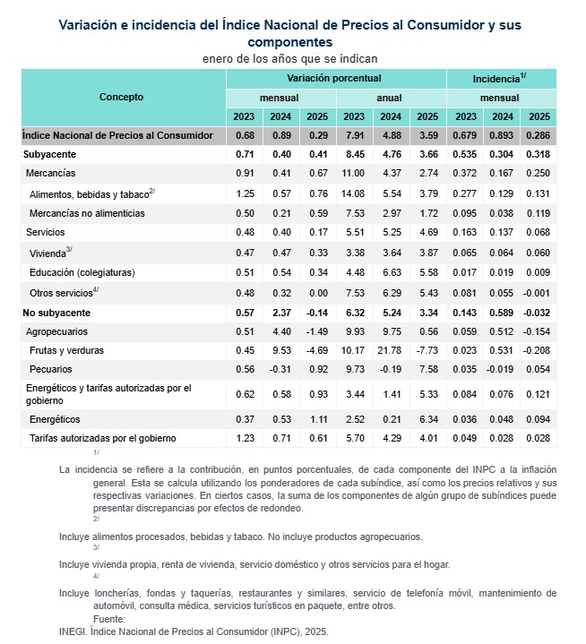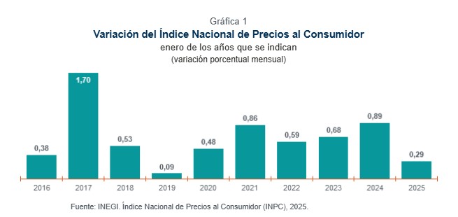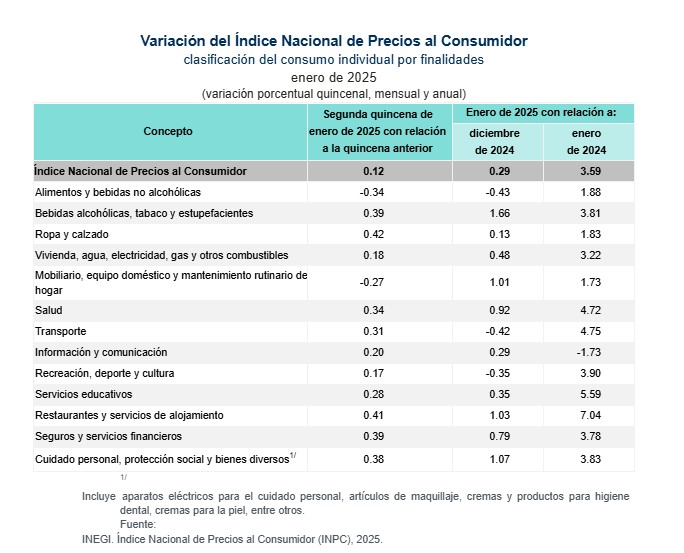En la primera y segunda quincena de enero de 2025, el INPC registró niveles de 138.257 y 138.429, respectivamente. Esto implicó un aumento quincenal de 0.12 por ciento.