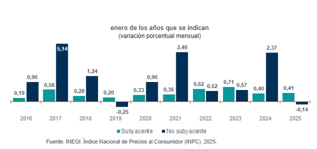 En enero de este año, la variación mensual de los índices subyacente y no subyacente fue de 0.41 y -0.14 %, respectivamente. En el mismo mes de 2024, fue de 0.40 y 2.37 % (ver gráfica 2).