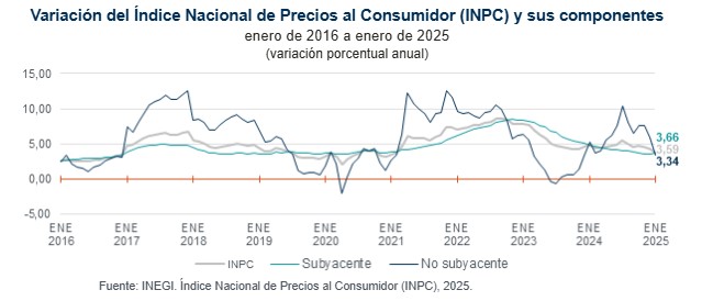 El índice de precios subyacente, que excluye bienes y servicios con precios más volátiles, o que no responden a condiciones de mercado, incrementó 0.41 % a tasa mensual. A su interior, los precios de las mercancías subieron 0.67 % y los de servicios, 0.17 por ciento.
