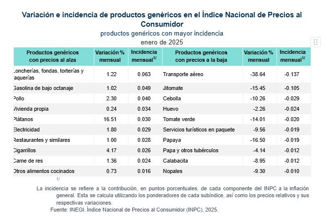 En enero de 2025, los productos genéricos cuyas variaciones de precios, al alza y a la baja, destacaron por su incidencia sobre la inflación general fueron: loncherías, fondas, torterías y taquerías; gasolina de bajo octanaje; pollo, así como vivienda propia, con incrementos en sus precios. En contraste, el transporte aéreo, el jitomate, la cebolla y el huevo disminuyeron sus precios (ver cuadro 2).