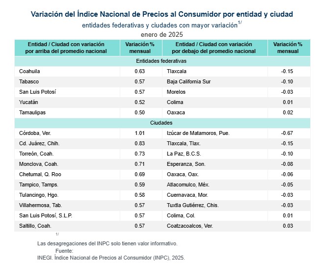 En el siguiente cuadro, se presentan las entidades federativas y ciudades en las que el INPC alcanzó las mayores variaciones durante enero de 2025.