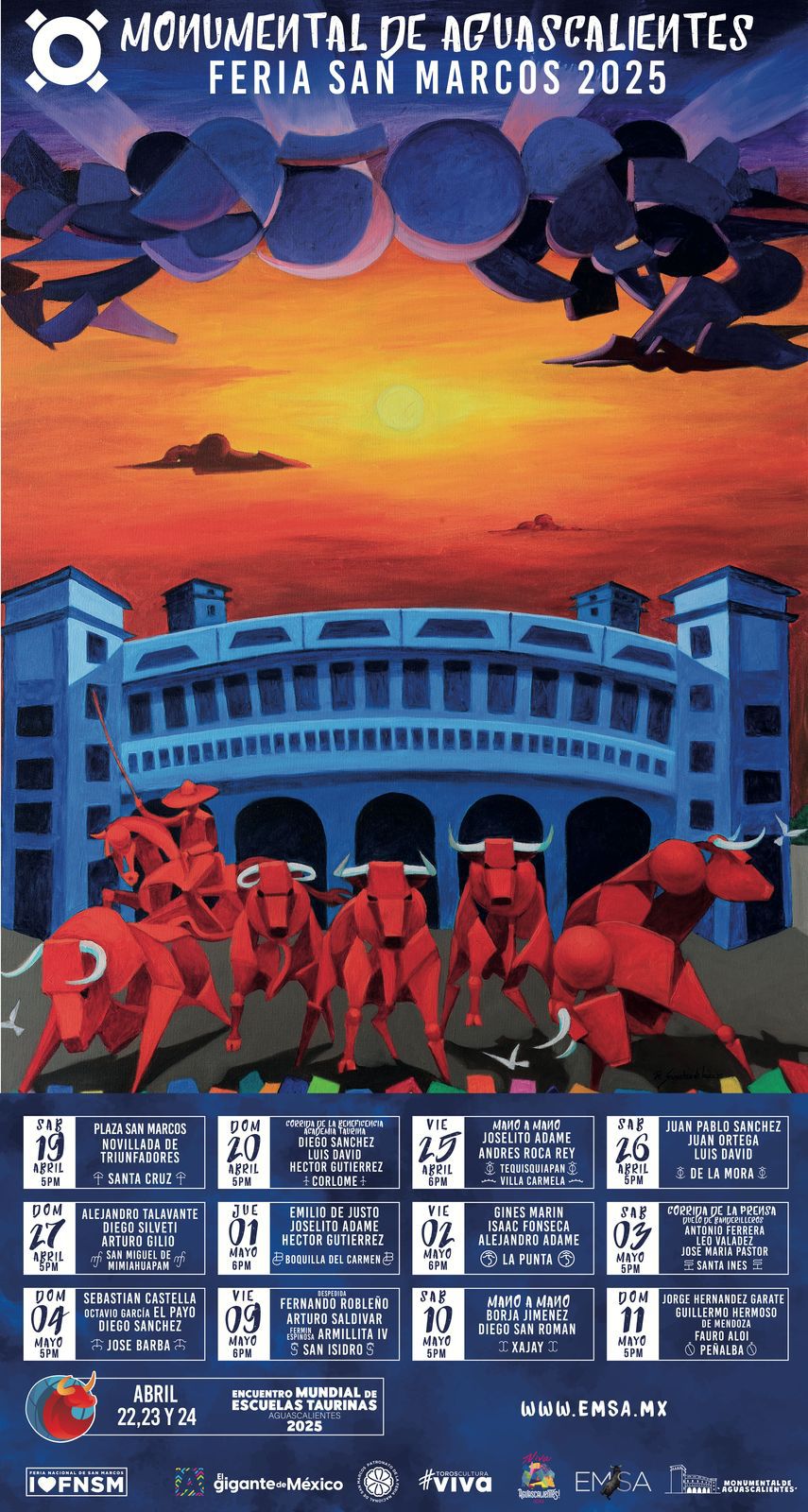 Por su parte, José Ángel González Serna, presidente del Patronato de la FNSM, destacó que Aguascalientes ha sido cuna de grandes matadores y que las corridas son parte esencial de su identidad. Asimismo, Rafael Sánchez de Icaza, autor de la obra que ilustra el cartel del serial, expresó su orgullo por plasmar en su pintura los atardeceres, la plaza y el encierro de seis toros, coincidiendo con el aniversario 50 del coso taurino y sus cinco décadas como pintor.