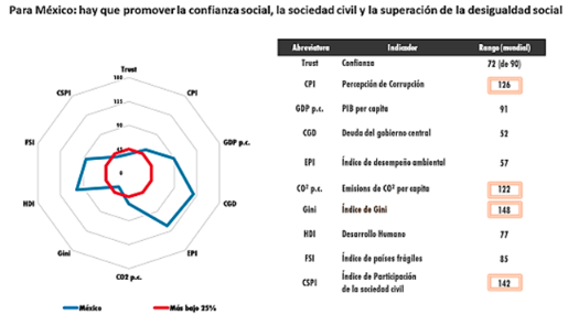Para el caso específico de México, y de acuerdo con el índice de inclusividad, no se han dado las condiciones para garantizar el acceso a los mismos derechos, oportunidades y recursos para todos, por carecer de una sociedad participativa, una mejor distribución de los recursos y presentar altos niveles de corrupción y desconfianza.