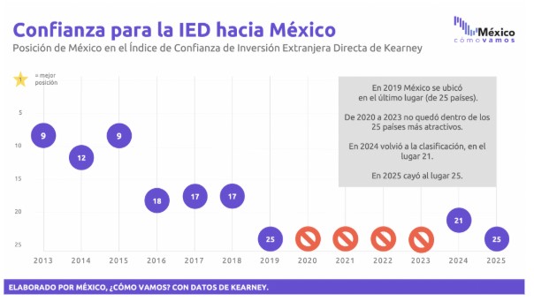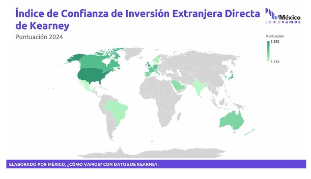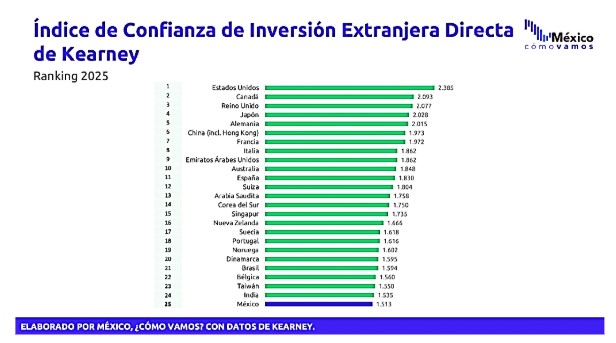 Conforme al Índice de Confianza de Inversión Extranjera Directa (IED), los Estados Unidos, Canadá y Reino Unido son los tres países más atractivos para la inversión extranjera, según la edición 2025 del estudio que realiza regularmente la consultora Kearney, basado en una encuesta entre ejecutivos entre empresas multinacionales. México, llegó a situarse en el top ten de los países con mayor confianza (2013 y 2015); después de cinco años de no figurar, fue clasificado como 21° en el 2024 pero ahora es lugar 25°, siendo superado por Emiratos Árabes Unidos, Arabia Saudita, Singapur, Taiwán e India.