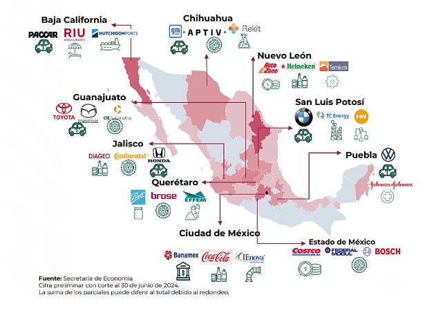 El 79% de la IED recibida al cuarto trimestre del 2024, se concentró en diez entidades federativas del país. Los cinco principales países de origen fueron: EEUU, con el 45%, Japón y Alemania con el 22%, Canadá y Países Bajos con 14%.