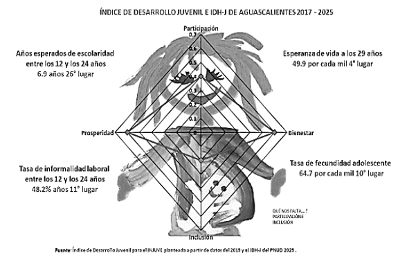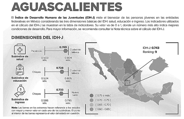 Aguascalientes es 4° lugar entre las 32 entidades federativas en esperanza de vida después de los 29 años; 11° en tasa de informalidad laboral entre los 12 y los 29 con 48.2%; 10° lugar en alta tasa de fecundidad adolescente con 64.7 por cada mil menores, índice semejante al de Afganistán y un bajísimo 26° lugar en años esperados de escolaridad entre los 12 y los 24 años por 6.9 años.