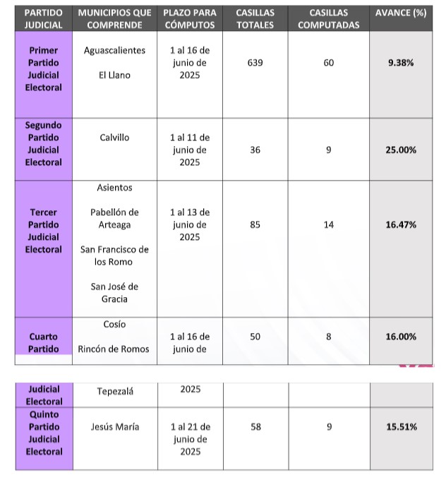 - Dando continuidad a las actividades de los cómputos de los resultados de la jornada de votación del Proceso Electoral Extraordinario del Poder Judicial del Estado de Aguascalientes 2025 (PEEPJEA), se informa que, con corte a las 15:00 HORAS de este martes 03 de junio de 2025, se cuenta con el siguiente avance: