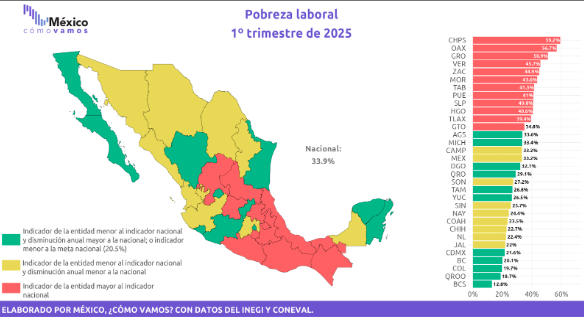 La tercera parte de la población ocupada en Aguascalientes presenta pobreza laboral al 1er trimestre del 2025. La entidad hidrocálida se encuentra entre el 44% de Zacatecas y el 22% de Jalisco. La pobreza laboral se detecta más presente entre las mujeres que entre los hombres igual que la informalidad en su ocupación.