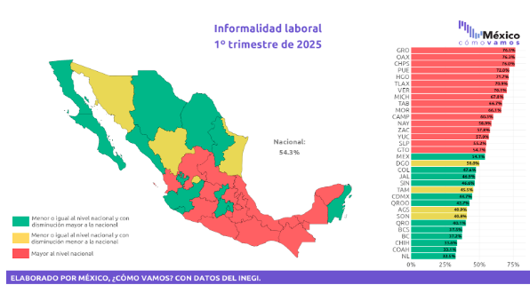 Estados como Chiapas, Oaxaca y Guerrero no solo presentan algunos de los niveles más altos de pobreza laboral del país, sino también las mayores proporciones de trabajadoras y trabajadores en la informalidad. Por otro lado, se observa que Chihuahua presenta la menor informalidad laboral para mujeres y Nuevo León para hombres, con tasas de 30.87% y 30.3%, respectivamente.