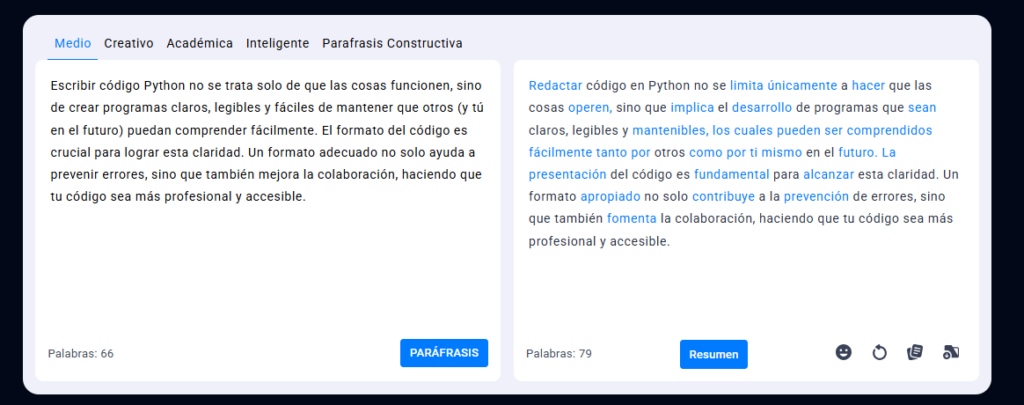 En cuanto a funciones, Parafraseador ofrece mucho. Por ejemplo, incluye cinco modos de reformulación para que los usuarios adapten el tono de sus escritos a un estilo específico.