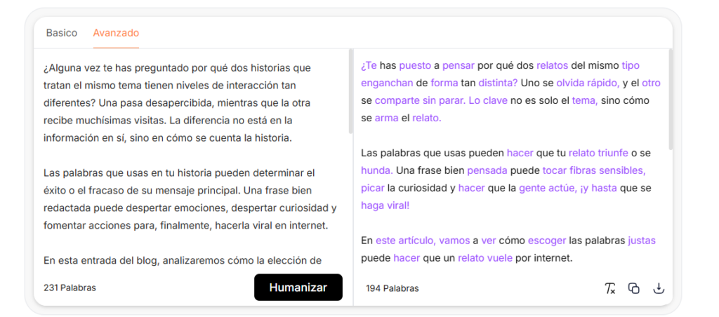 La herramienta ofrece dos modos, cada uno con un enfoque de humanización diferente. Esto significa que, si se procesa el mismo texto con estos modos, los resultados serán diferentes, pero tendrán el mismo significado.