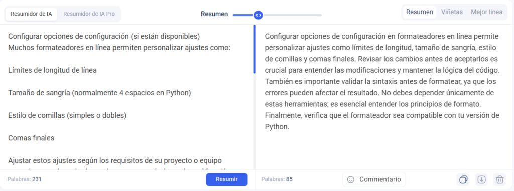 Resumen de Textos ofrece dos modos de resumen y un ajustador de longitud. Este ajuste permite a los usuarios restringir el resultado de la herramienta según sus necesidades y preferencias.