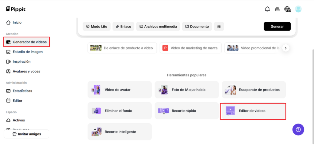 Abre Pippit y entra en la sección Video Generator. Selecciona el editor y sube tu clip con arrastrar y soltar para comenzar al instante.