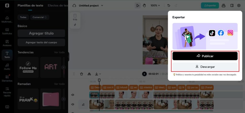 Los vídeos comprimidos son más fáciles de reutilizar. Puedes exportar múltiples formatos —vertical corto, cuadrado para feed, vista previa con miniatura— todo desde la misma edición, sin pasar horas exportando.