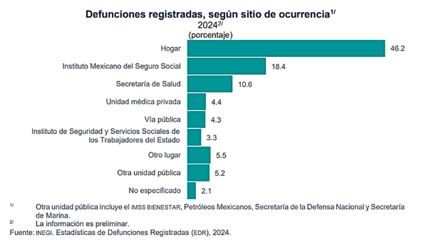 En México, durante el periodo de referencia 2024, se contabilizaron 818 mil 437 defunciones registradas. La cifra fue mayor en 18 mil 568 casos respecto a la que se presentó en forma definitiva el año anterior, lo que representa un incremento de 2.3 por ciento. La tasa bruta de defunciones registradas por cada 100 mil habitantes fue de 629, mayor en 10 unidades a la del año anterior.