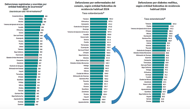 - La más común de las defunciones entre los mexicanos se debe a enfermedades del corazón son 148 por cada 100 mil habitantes. Es un tipo de defunción que se presenta más entre los Guanajuatenses y Potosinos 159 y 157 que entre los Zacatecanos 124 y Aguascalentenses 104.