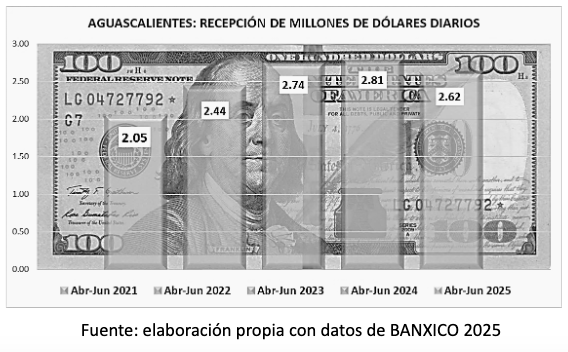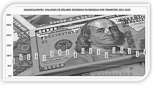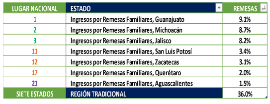 Más de uno de cada tres dólares enviados por remesas, son recibidos en el país por las familias de la región tradicional conformada por siete de los 32 estados de la República. El año pasado Aguascalientes, uno de los estados tradicionales, recibió 958 millones de dólares, es decir veinte millones más que en el 2023 pero probablemente serán 20 millones menos los que se recibirán este 2025.