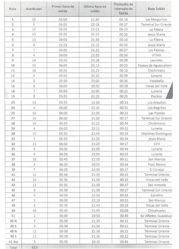 En el cuadro se observa que hay rutas con tiempos de espera de más de 45 minutos, lo que implica casi una hora antes de iniciar el trayecto, el cual puede durar más de una hora dependiendo de la distancia. Además, se reporta una flota de 415 autobuses para atender toda la ciudad, cifra insuficiente para cubrir la demanda, sobre todo en horas pico, cuando los vehículos se saturan y los usuarios deben esperar el siguiente, lo que puede añadir otra hora al traslado.