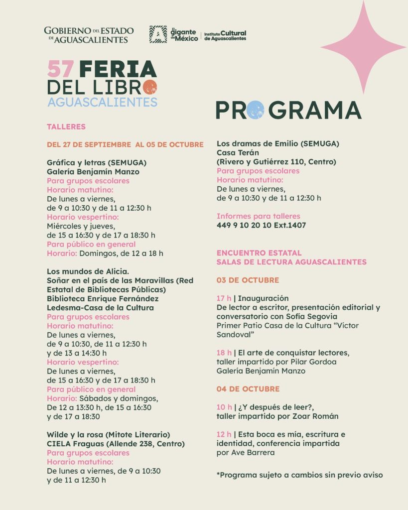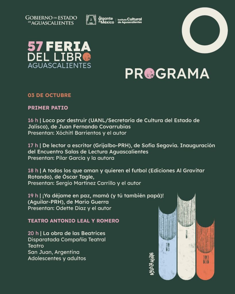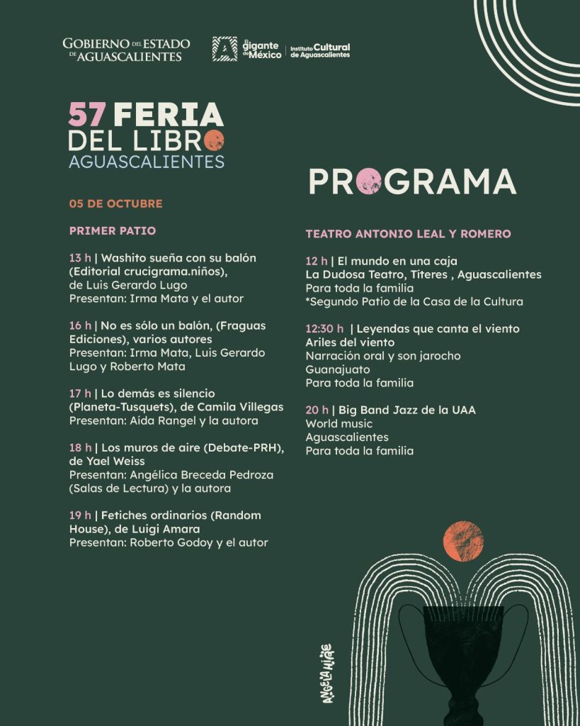 La 57.ª Feria del Libro Aguascalientes 2025 se presenta como un evento cultural imperdible organizado por el Instituto Cultural de Aguascalientes (ICA), bajo el lema “Mente sana, libro en mano”. Esta edición se llevará a cabo en la Casa de la Cultura Víctor Sandoval, en la capital del estado, del sábado 27 de septiembre al domingo 5 de octubre, con estands abiertos al público todos los días, de 10:00 a 21:00 horas.