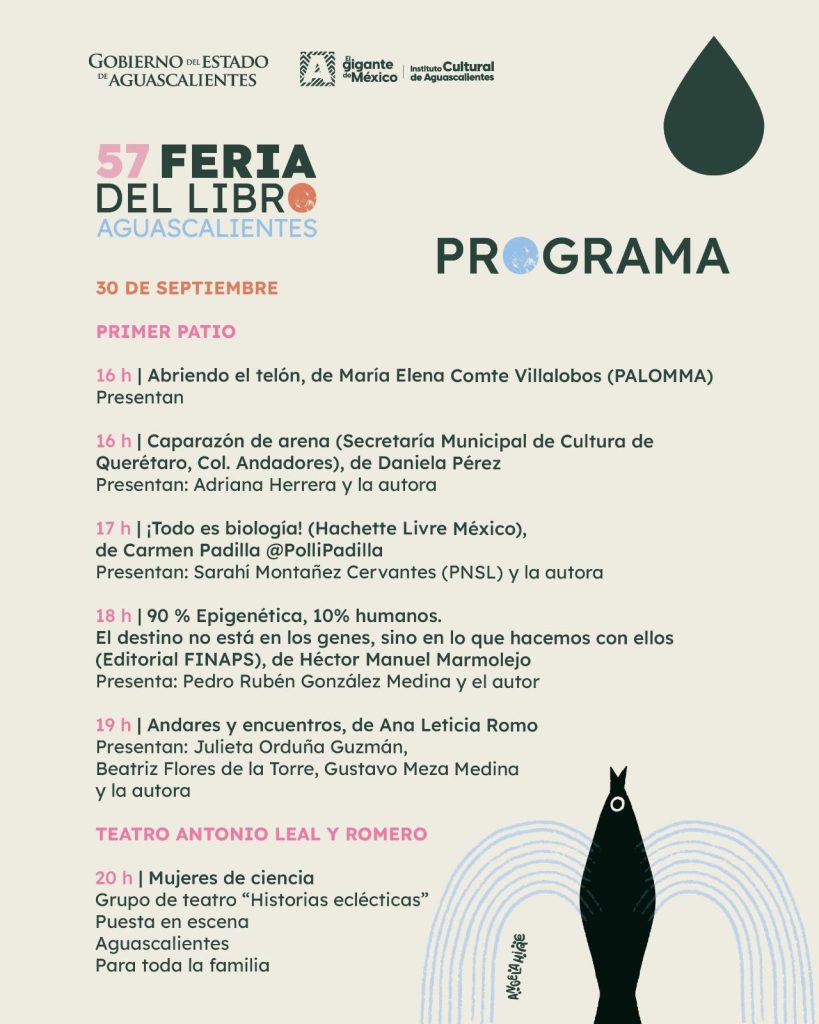 - Martes 30 de septiembre: Presentaciones en el Primer Patio de Daniela Pérez con Caparazón de arena (16:00 h) y de Carmen Padilla con ¡Todo es biología! (17:00 h). A las 20:00 h, el Teatro Antonio Leal y Romero recibirá la obra Mujeres de ciencia, por el grupo Historias Eclécticas.