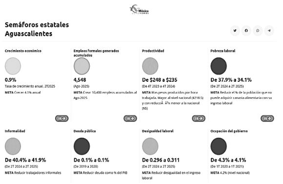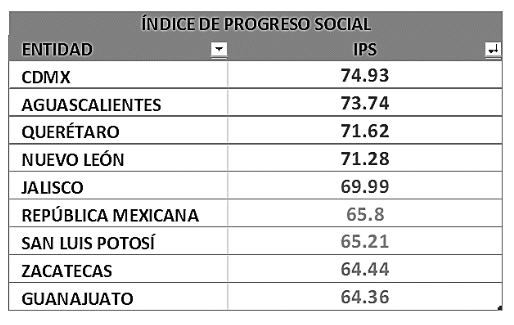 Haciendo una valoración de los Semáforos Económicos de México Cómo Vamos, tenemos al país con una calificación de 65.6, muy cercana a su Índice de Progreso Social (IPS) de 65.8, lo que lo posicionó en el lugar 69 a nivel mundial. La Ciudad de México, Aguascalientes, Baja California Sur, Querétaro y Nuevo León fueron las cinco entidades con el mejor desempeño en el IPS. Aguascalientes destacó como uno de los estados con mayor progreso social, con un puntaje de 73.7.