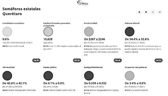 Crecimiento Económico: En el segundo trimestre de 2025, el PIB creció 1.2% anual, lo que mantiene el semáforo de crecimiento en naranja debido al bajo desempeño.