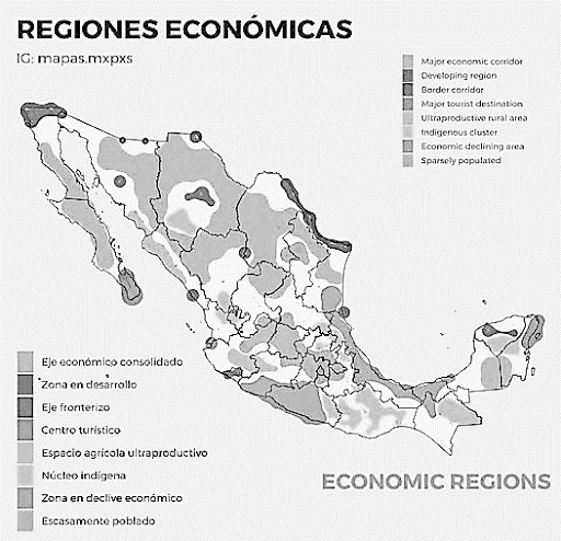 Sin embargo, un mapa sobre las zonas económicas más consolidadas en México muestra una división que agrupa a los estados por su desarrollo y dinamismo económico. Estas son la región Noreste (básicamente Monterrey-Saltillo.), y la región Centro Occidente que va de la zona metropolitana de la capital hacia la región del Bajío: Jalisco, Guanajuato, Querétaro, San Luis Potosí, Aguascalientes, etc.