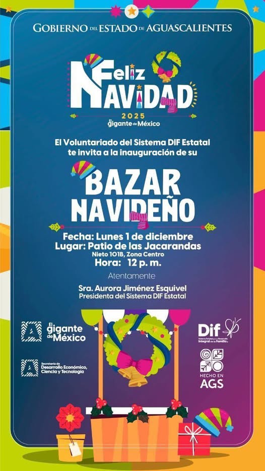 El DIF Estatal de Aguascalientes llevará a cabo el Bazar Navideño 2025, un espacio donde la ciudadanía podrá encontrar productos elaborados por artesanos y emprendedores locales, incluyendo la marca Hecho en Aguascalientes, el Grupo Abuelos Emprendedores del Gerontológico, así como artículos creados por personas con discapacidad del municipio.