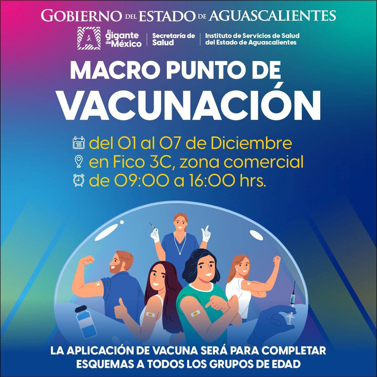 El Gobierno del Estado de Aguascalientes, a través del Instituto de Servicios de Salud, invita a la población a acudir al macropunto de vacunación que estará disponible del 1 al 7 de diciembre, en un horario de 9:00 a 16:00 horas, en la zona comercial de Fico 3C.