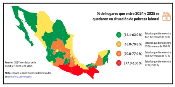 No obstante, en la actualización 2025 de la fuente del CEEY, la Región Centro Norte, conformada por Jalisco, Michoacán, Colima, Aguascalientes y San Luis Potosí, sólo Jalisco presenta pobreza laboral en verde, Colima y Aguascalientes aparecen en amarillo y Michoacán en color naranja. La persistencia de pobreza laboral o el porcentaje de hogares que permanecieron en pobreza laboral en comparación con el año anterior en el país es de 69.6%.