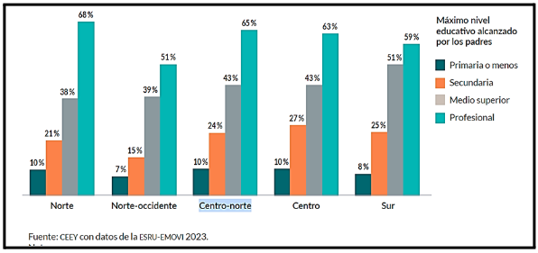 En la región Centro Norte hay 65% de probabilidades de que los hijos de padres profesionistas logren también serlo; lo que baja al 43% con estudios parentales de bachillerato; 24% con sólo secundaria y se reduce a uno de cada diez con estudios primarios. La educación es un medio importante para la movilidad social.
