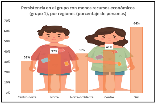 En las cinco regiones del país se observa un patrón heterogéneo. La región sur mantiene una persistencia intergeneracional de la condición de pobreza más alta que la nacional con el 64%; mientras la región centro se ubica con el 41% de persistencia. En cuanto a la región centro-norte, se observa la mejora más significativa, al tener una mayor reducción de la incidencia de la pobreza y también porque presenta la evolución más favorable en la disminución de la persistencia intergeneracional, con el 31%.