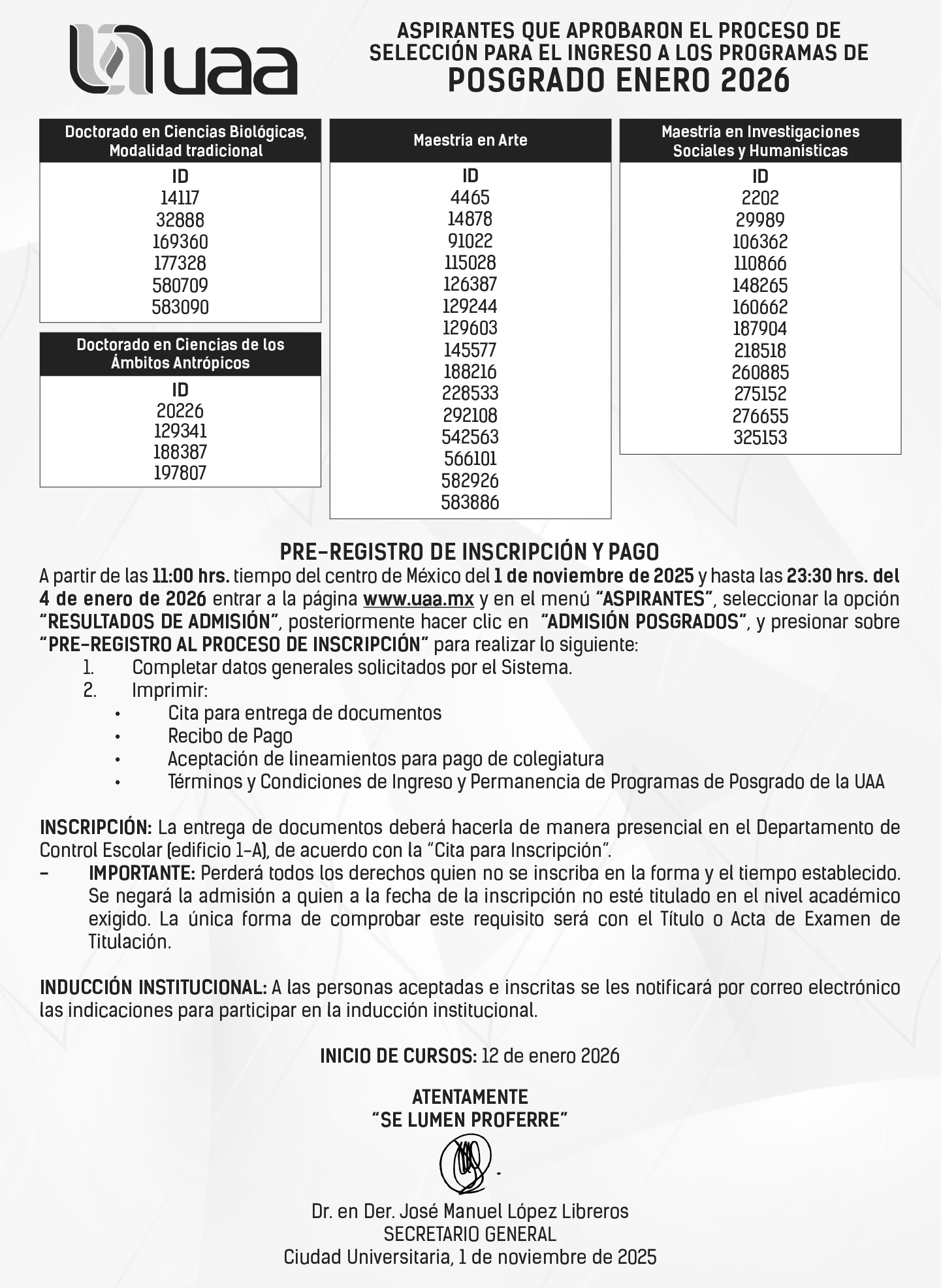 Te compartimos Resultados para el ingreso de los programas de posgrado enero 2026 en la UAA.