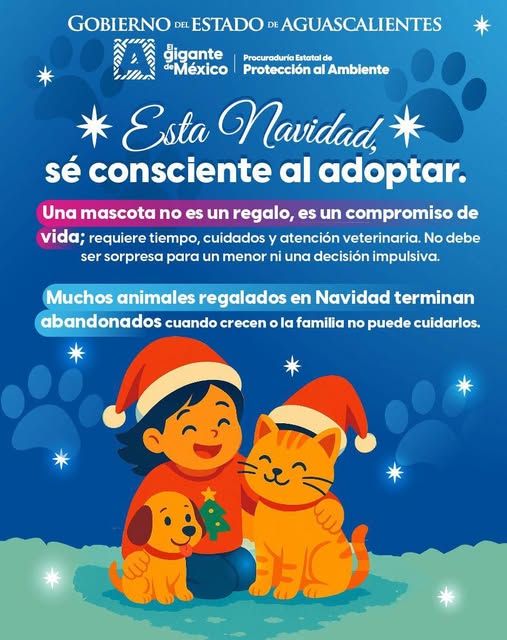 En el marco de las celebraciones decembrinas, el Gobierno del Estado de Aguascalientes, a través de la Procuraduría Estatal de Protección al Ambiente, invita a la población a reflexionar sobre el verdadero significado de regalar una mascota durante la Navidad, promoviendo la adopción responsable y consciente como un acto de amor y responsabilidad.