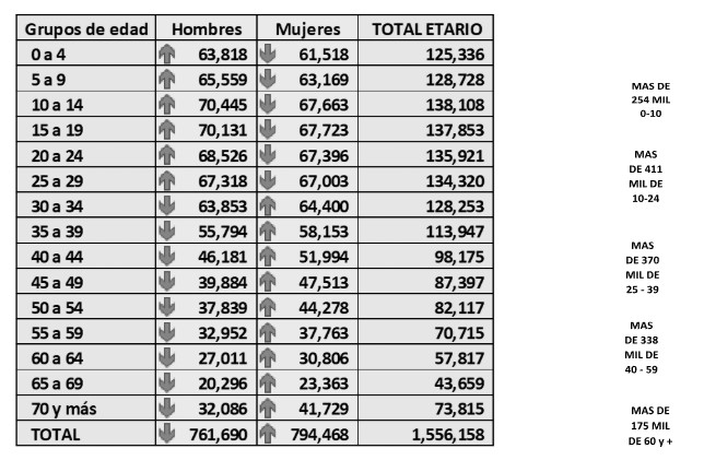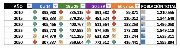 Es muy importante considerar que nos encontramos dentro de una transición demográfica, que reducirá la fecundidad e incrementará el envejecimiento; las necesidades cada vez serán diferentes y todo se verá influido por estas nuevas circunstancias. La edad mediana actual es de 30 años, es decir que la mitad de la población cuenta con más de 30 y la otra menos de 30 años y la mayoría de los menores de 30 años viven en el Oriente de la ciudad capital.