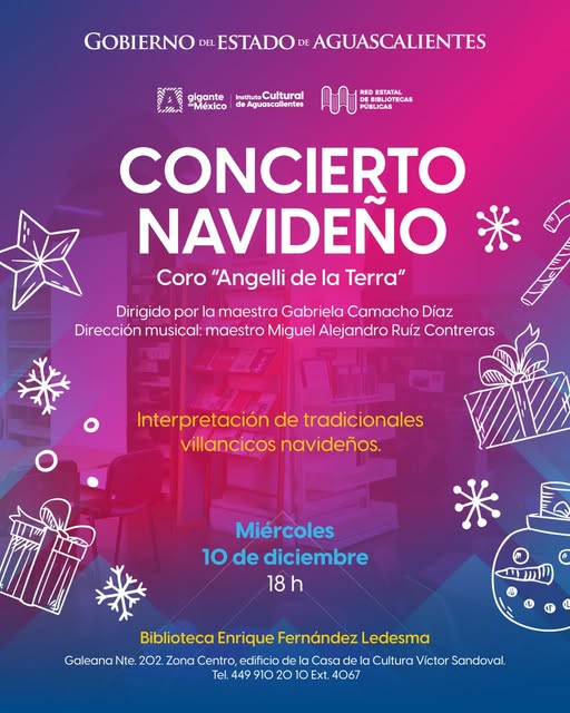 - La Biblioteca Enrique Fernández Ledesma invita al público a disfrutar de un Concierto Navideño a cargo del Coro Angelli della Terra, una velada musical que llenará el espacio de villancicos y espíritu festivo en el corazón de Aguascalientes.