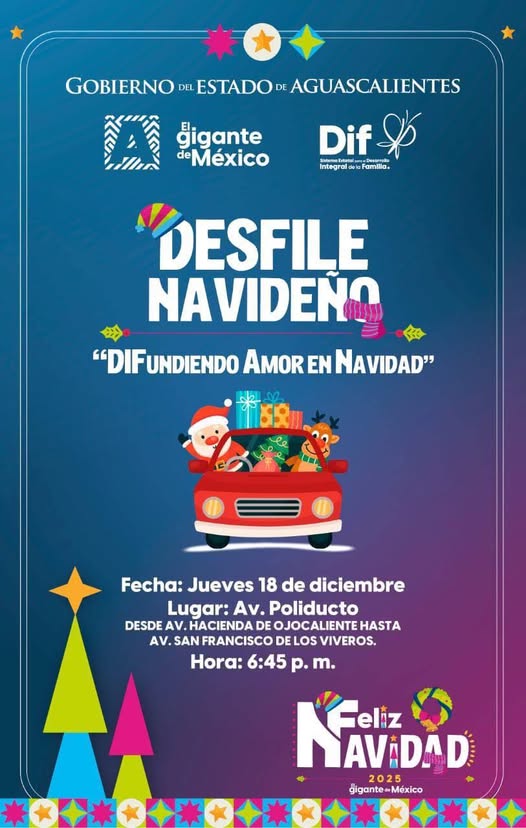 • El Gobierno del Estado de Aguascalientes y el Sistema DIF Estatal invitan a las familias a disfrutar del Desfile Navideño “DIFundiendo Amor en Navidad”, un evento lleno de magia, alegría y unión que recorrerá importantes avenidas para celebrar la temporada decembrina.