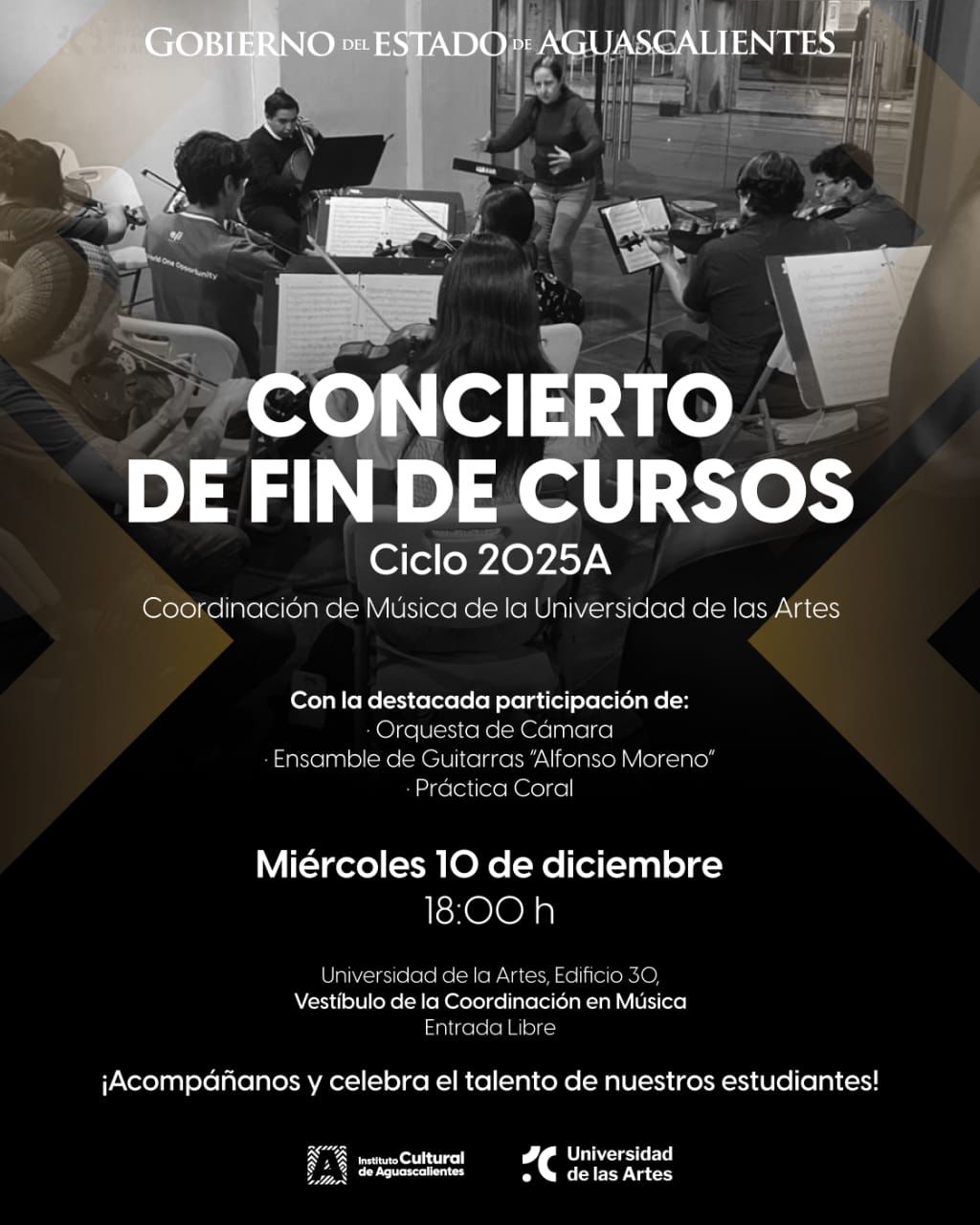 Como parte del cierre del ciclo escolar 2025A, la Coordinación de Música de la Universidad de las Artes invita a disfrutar del Concierto de Fin de Cursos, que reunirá talento, dedicación y creatividad en una velada musical abierta al público.