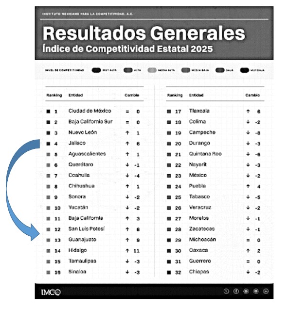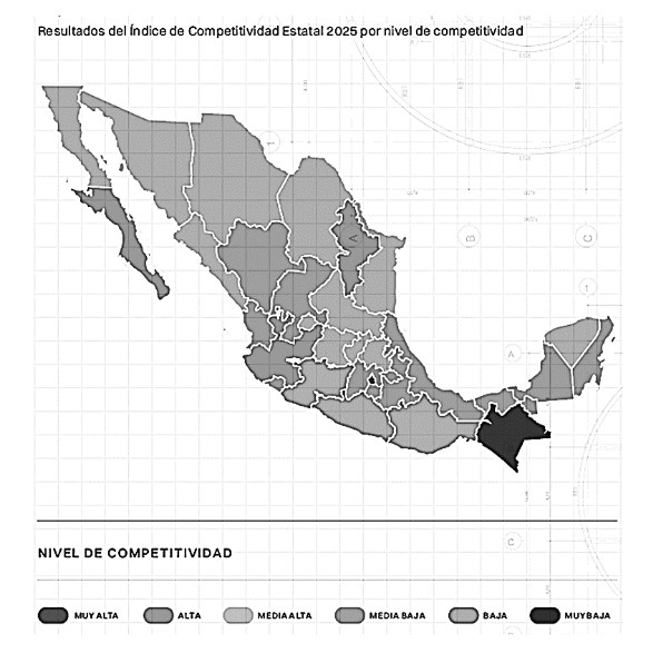 El IMCO publica el Índice de Competitividad Estatal (ICE), que clasifica a los estados de México en diferentes niveles de competitividad. Según el ICE 2025, los estados más competitivos son la Ciudad de México, Baja California Sur, Nuevo León, Jalisco y Aguascalientes, mientras que los de menor competitividad son Chiapas, Michoacán, Oaxaca y Guerrero. El ICE analiza el desempeño de las 32 entidades federativas a partir de 53 indicadores agrupados en 6 subíndices que miden la capacidad estructural de cada estado para generar, atraer y retener talento e inversión.