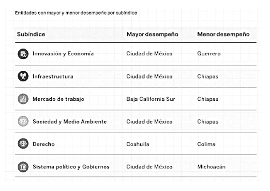 Para estándares internacionales solo contamos con cuatro de las 32 entidades en verde: CDMX, Baja California Sur, Nuevo León y Jalisco. La CDMX gana el liderazgo en cuatro de los seis subíndices; sólo rebasado por Coahuila en Estado de Derecho y por Baja California Sur en Mercado de Trabajo.