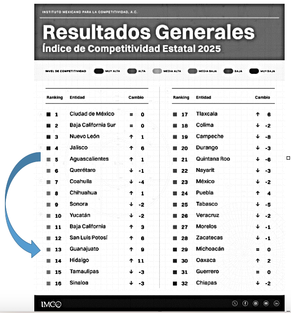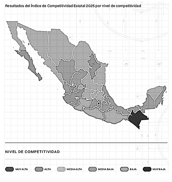 El IMCO publica el Índice de Competitividad Estatal (ICE), que clasifica a los estados de México en diferentes niveles de competitividad. Según el ICE 2025, los estados más competitivos son la Ciudad de México, Baja California Sur, Nuevo León, Jalisco y Aguascalientes, mientras que los de menor competitividad son Chiapas, Michoacán, Oaxaca y Guerrero. El ICE analiza el desempeño de las 32 entidades federativas a partir de 53 indicadores agrupados en 6 subíndices que miden la capacidad estructural de cada estado para generar, atraer y retener talento e inversión.