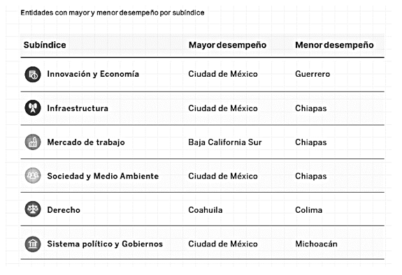 Para estándares internacionales solo contamos con cuatro de las 32 entidades en verde: CDMX, Baja California Sur, Nuevo León y Jalisco. La CDMX gana el liderazgo en cuatro de los seis subíndices; sólo rebasado por Coahuila en Estado de Derecho y por Baja California Sur en Mercado de Trabajo.