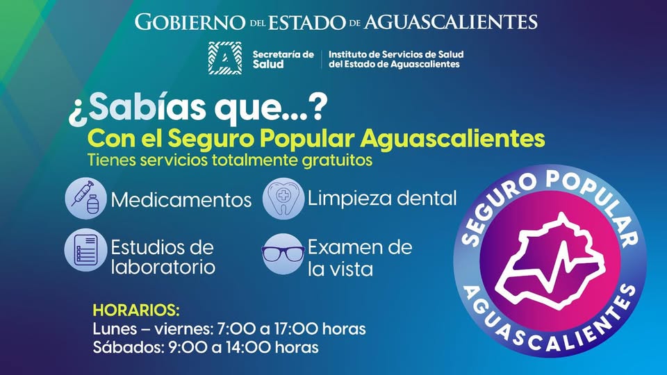- El Seguro Popular Aguascalientes brinda acceso a diversos servicios de salud gratuitos, como medicamentos, estudios de laboratorio, limpieza dental y examen de la vista, con el objetivo de cuidar el bienestar de las familias del estado.