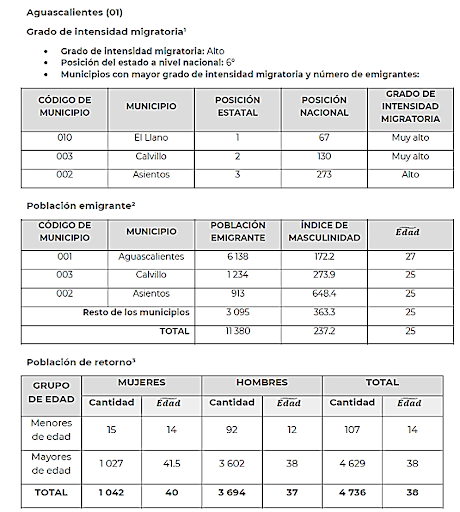 En el quinquenio analizado la población emigrante de la entidad ascendió a 11 mil 380 personas, con una mediana de edad de 25 años y un índice de masculinidad de 237.2 hombres por cada 100 mujeres. Los principales municipios de origen fueron Aguascalientes, Calvillo y Asientos y los principales destinos en la Unión Americana son: California, Texas e Illinois.