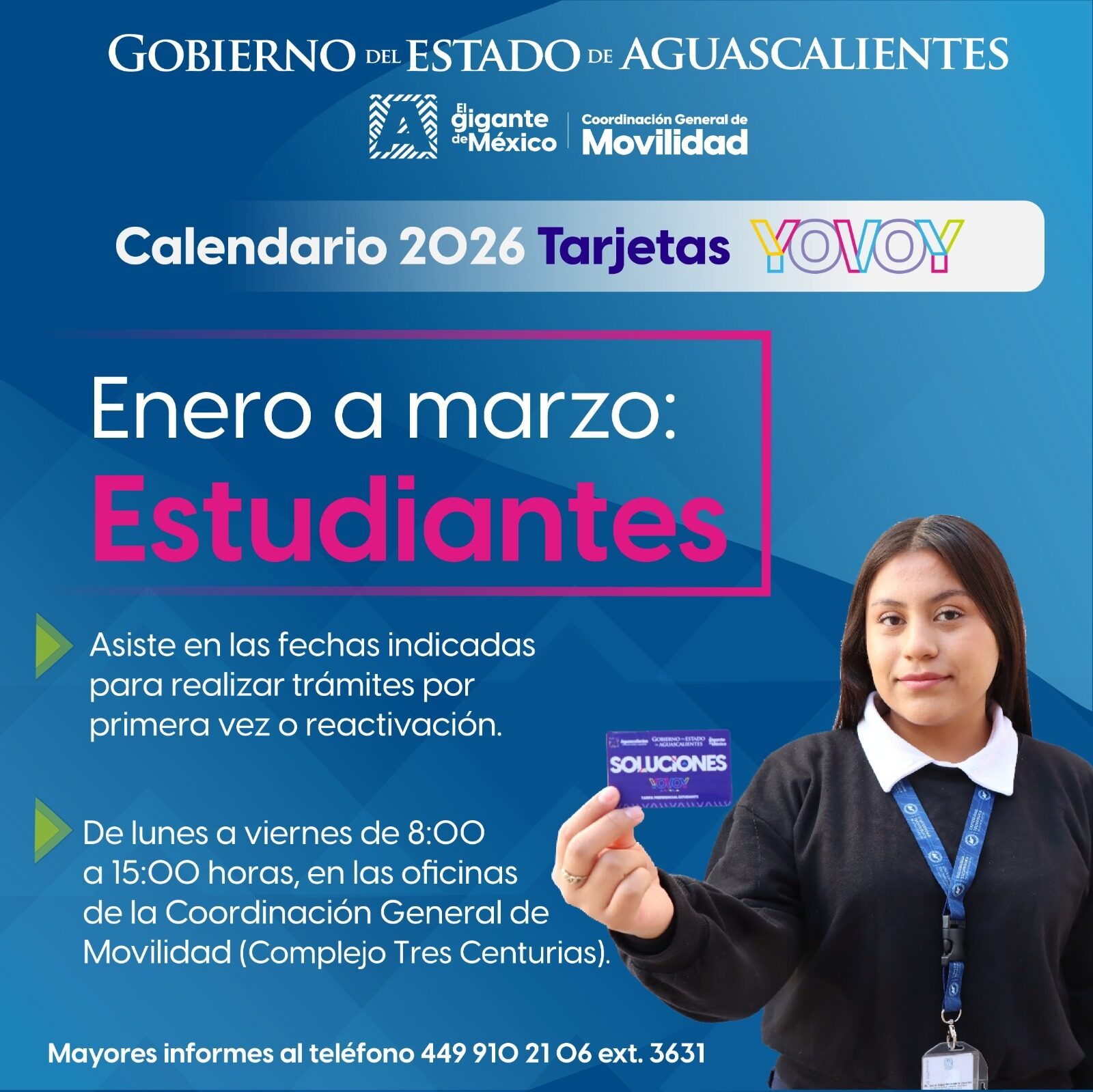 En apoyo a la economía familiar y para facilitar sus traslados diarios, el Gobierno del Estado de Aguascalientes invita a las y los estudiantes a tramitar por primera vez o reactivar la Tarjeta Soluciones YoVoy, que les permite acceder a un 50 por ciento de descuento en la tarifa de los camiones urbanos.