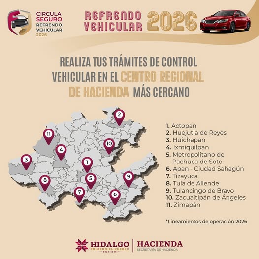 Con el propósito de facilitar el cumplimiento de las obligaciones vehiculares y promover una circulación ordenada y segura, el Gobierno de Hidalgo informa a las y los propietarios de vehículos que ya se encuentra disponible el trámite de Refrendo Vehicular 2026, el cual podrá realizarse hasta el próximo 30 de junio en los Centros Regionales de Hacienda distribuidos en todo el estado.