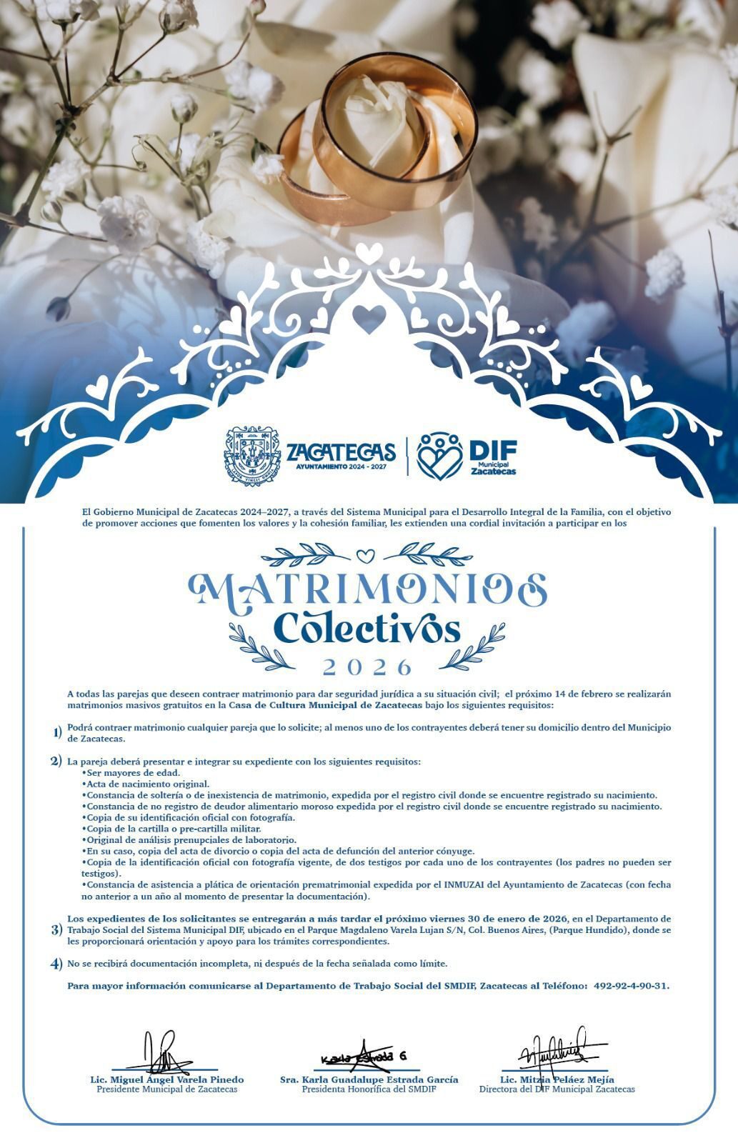 Con el objetivo de brindar seguridad legal y fortalecer el núcleo familiar, el Ayuntamiento de Zacatecas, en coordinación con el DIF Municipal, anunció la apertura de la convocatoria para los Matrimonios Colectivos 2026, una iniciativa que busca garantizar certeza jurídica a las parejas capitalinas.