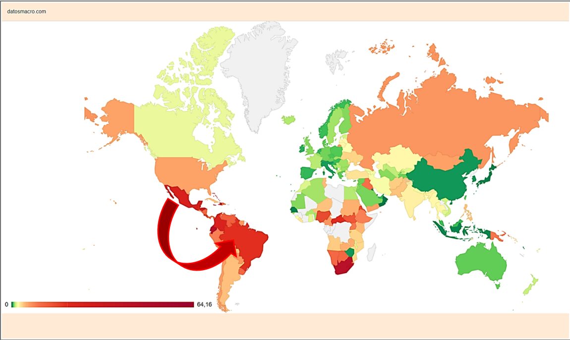 Hay zonas verdes más consolidadas en África del Norte y Oceanía que en América donde fuera de Canadá los demás países se encuentran en tono preventivo o rojo intenso como el corredor más largo del planeta en materia de violencia letal que va desde México hasta Brasil.